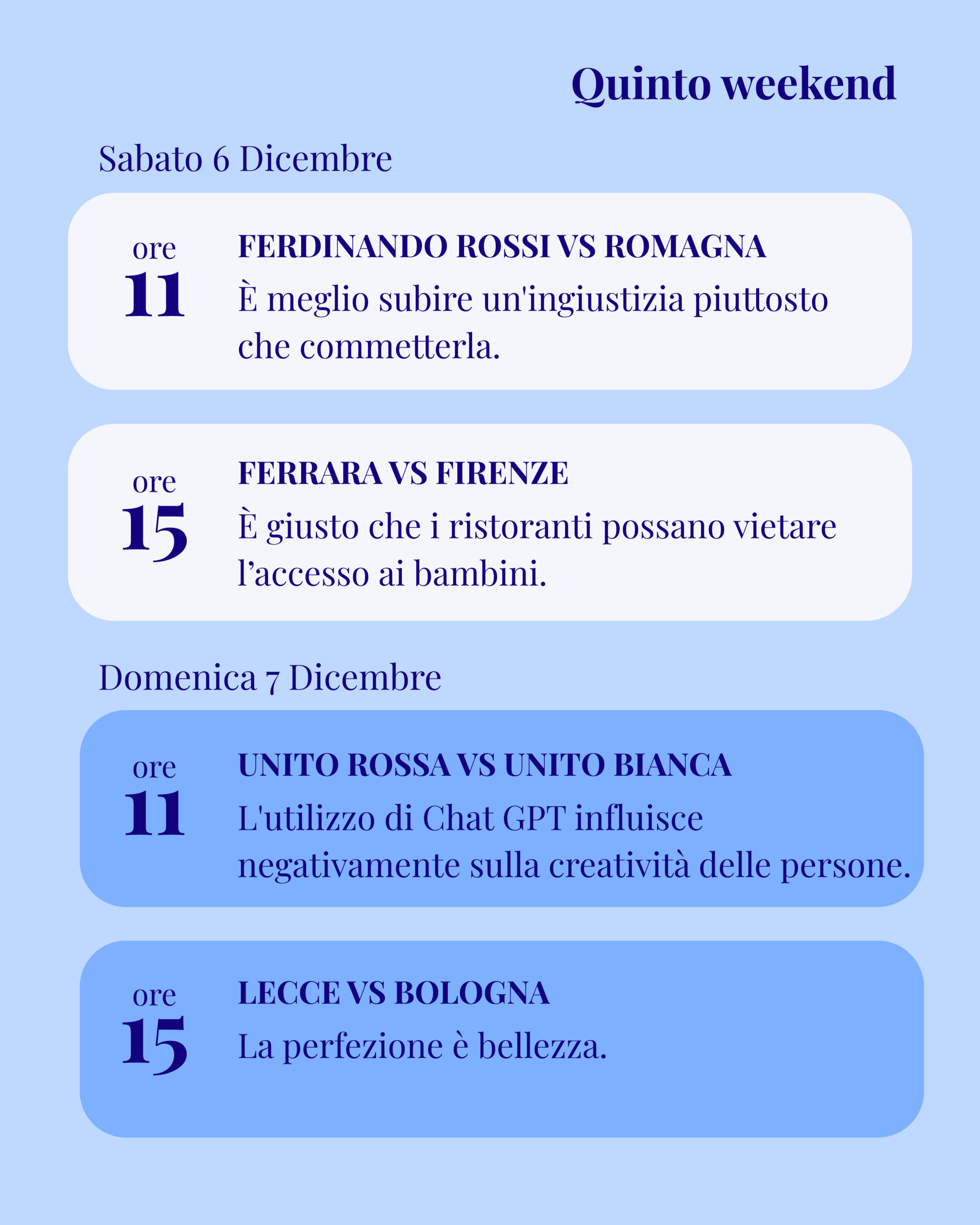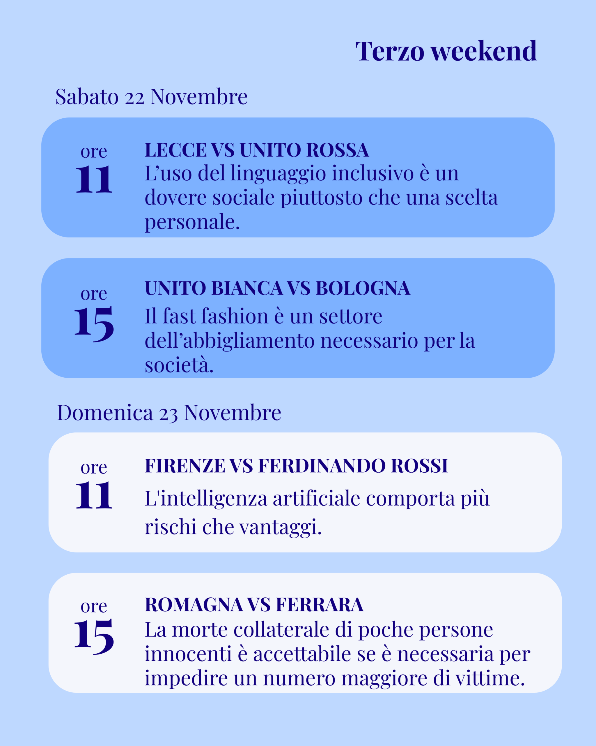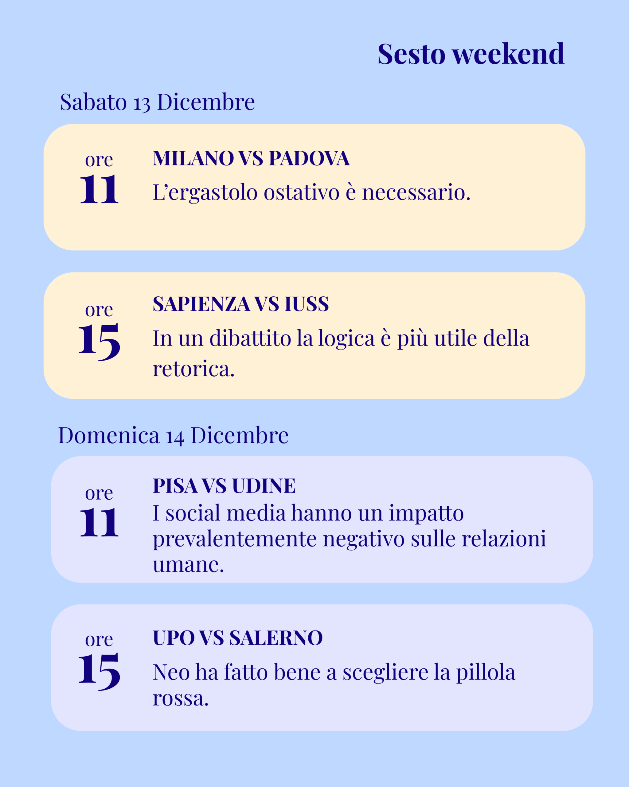 I dibattiti affrontano mozioni di attualità e questioni etiche, mettendo alla prova capacità argomentative, strategia e rigore formale. In questa pagina trovi calendario aggiornato, risultati e tabellone dell’edizione in corso.
