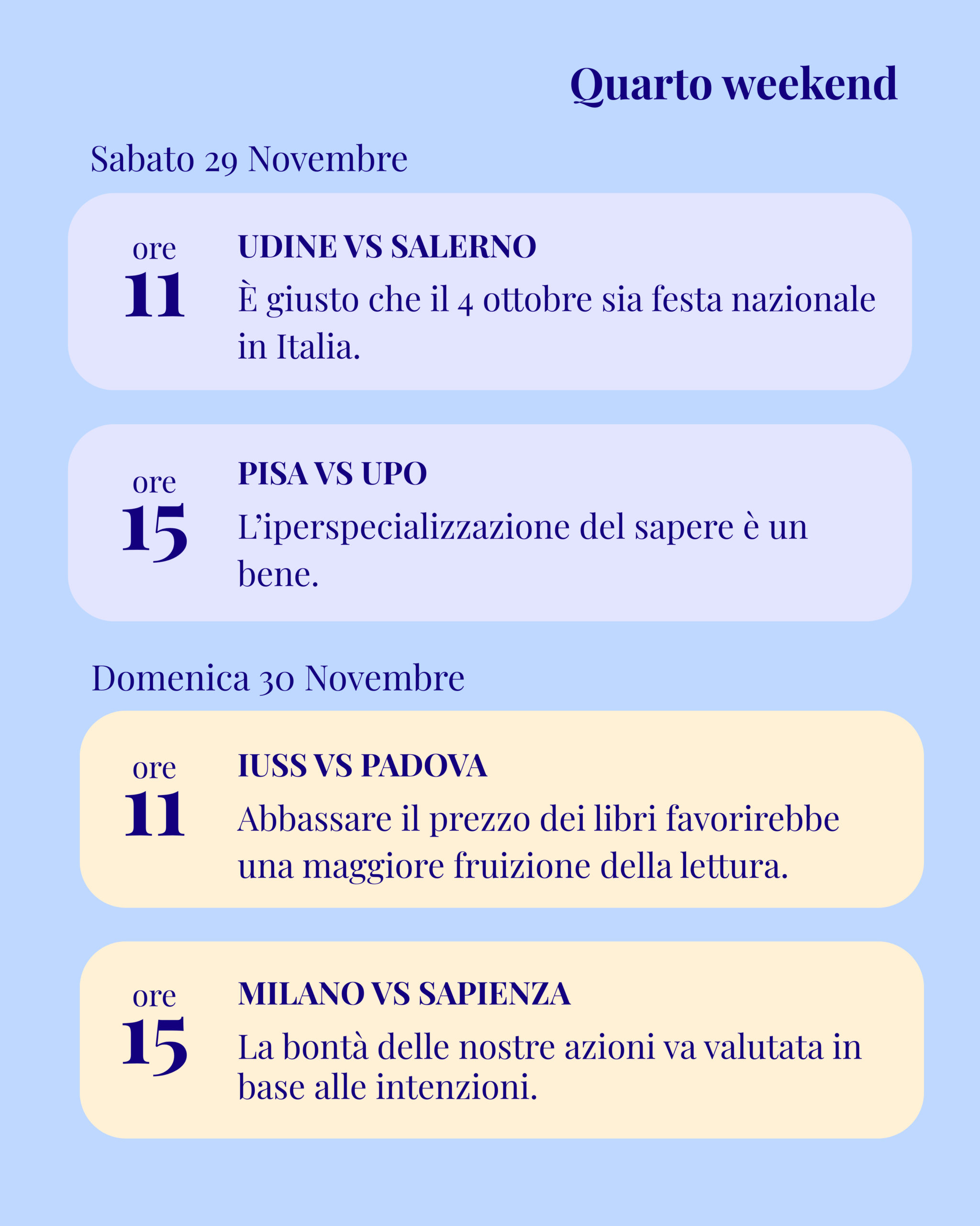 È in pieno svolgimento l’edizione 2026 del Torneo di Dibattito Interuniversitario, la competizione nazionale tra atenei italiani regolata dal protocollo Patavina Libertas. Conclusa la fase a gironi, le squadre sono ora impegnate nelle fasi ad eliminazione diretta, tra quarti di finale, semifinali e finale.
